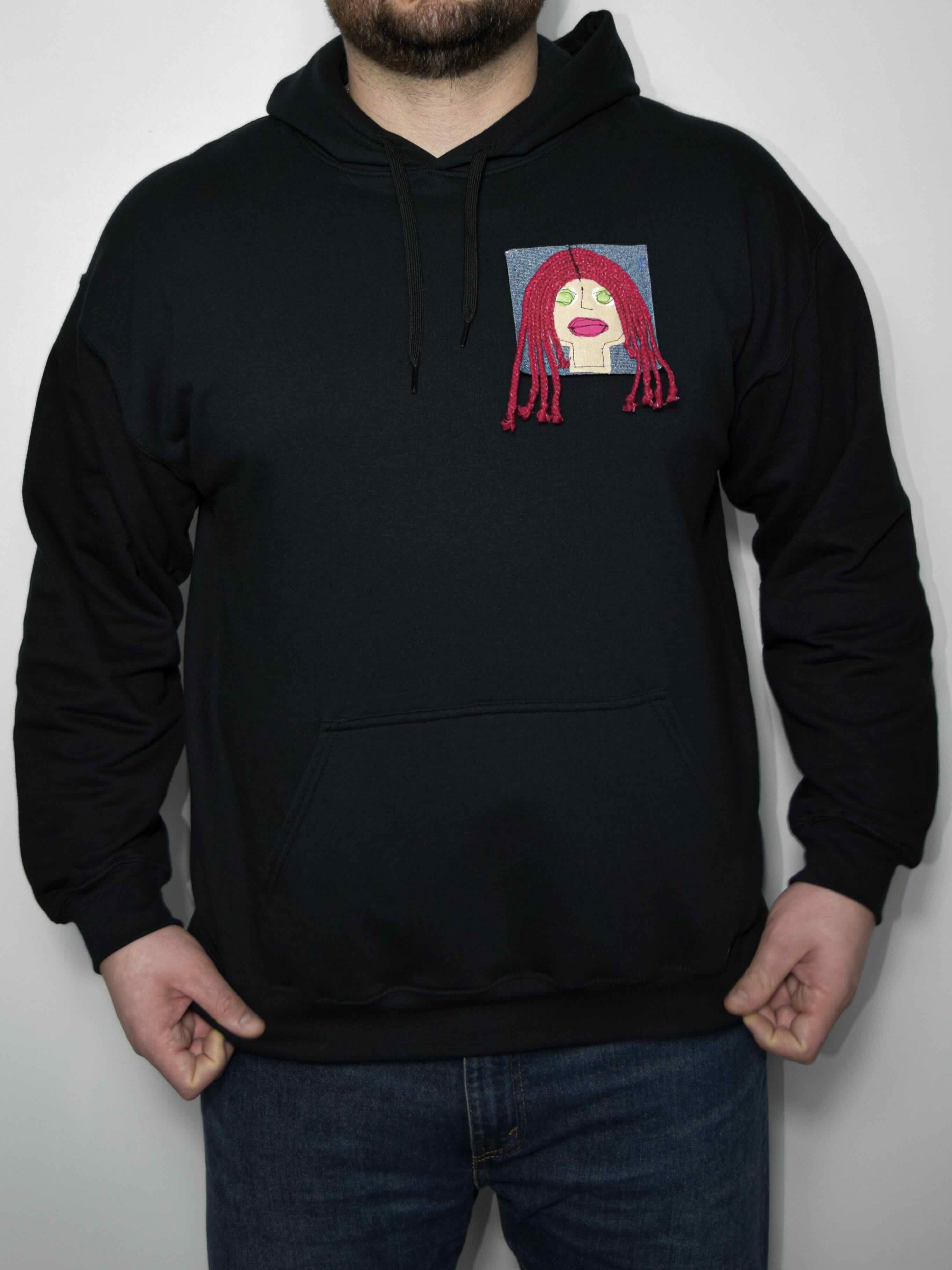Hanoracul este realizat din 80% bumbac și 20% poliester, cu densitatea materialului de 285 g/m², fapt care asigură durabilitatea în timp a acestuia. Peticul este din denim reciclat, igienizat corespunzător si aplicat pe o banda de velcro care reprezintă de altfel și sistemul prin care peticul este atașat articolului de îmbrăcăminte. Materialele care compun portretul sunt diverse.